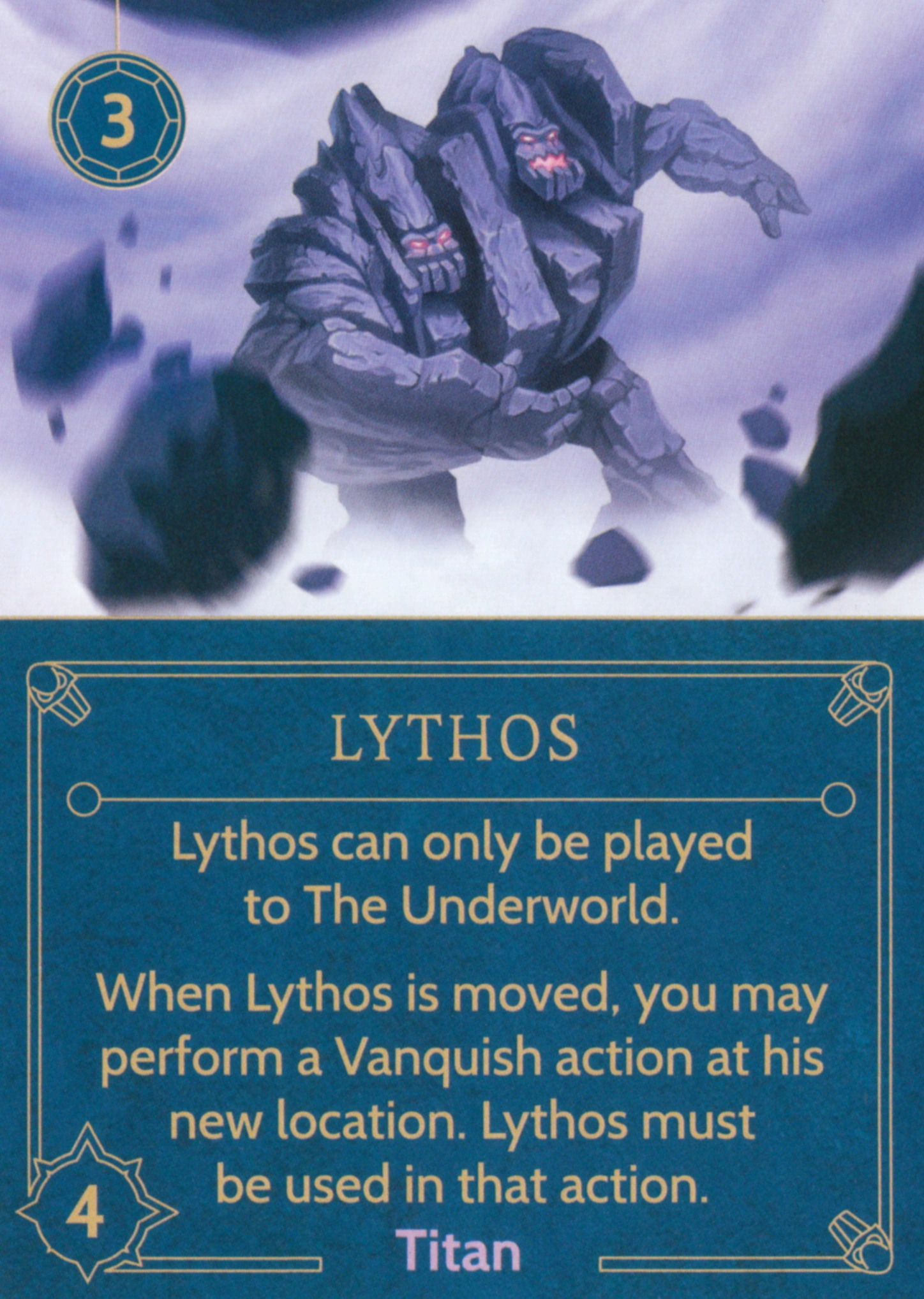 He has a unique card type, Titan. Titans have a Strength like Allies and can be used to defeat Heroes. They are his win condition, as he needs to move at least three of them to Mount Olympus. They can be trapped, which means they are turned sideways 90°, and cannot be moved, cannot participate in Vanquish actions, and do not count towards Hades' objective, until they are untrapped.