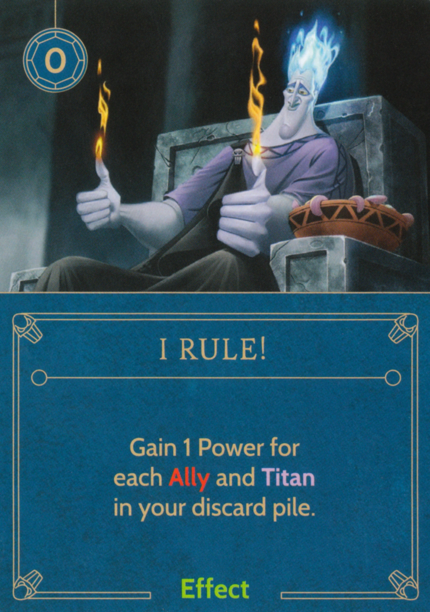 One key to winning as Hades is keeping Mount Olympus clear. Before you get a Titan in there, you'll want to be playing your Allies there, so you can regularly Vanquish anyone squatting there while you move a Titan at The Underworld. Ruthless can help you save Power in dropping both Allies and Titans, as long as you can get it to trigger (when playing against Prince John, Ratigan, or Syndrome for instance), but don't hold onto it if opponents aren't hoarding Power. Rage is relatively easy to trigger, and while it's most useful for getting Zeus out of Mount Olympus or Hercules out of The Underworld, it can also be used as an alternate way to keep your upper Fate and Move actions open, but if your opponent isn't going to be defeating anytime soon, discard it.